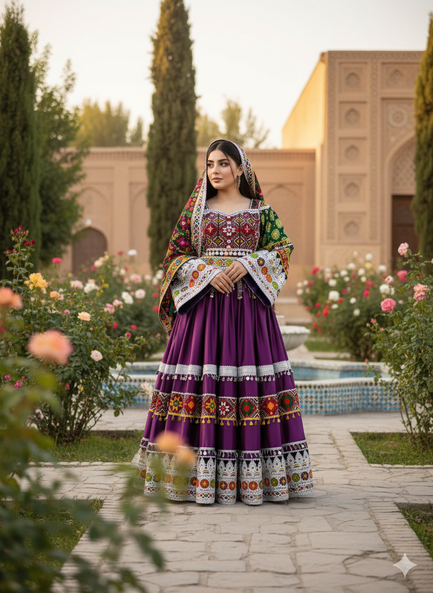 In a deep, regal purple, its flowing fabric, vibrant hand embroidery, and intricate patterns embody cultural pride and artistic mastery. To me, its graceful design is not only elegant but also a living connection to Afghanistan’s timeless heritage.