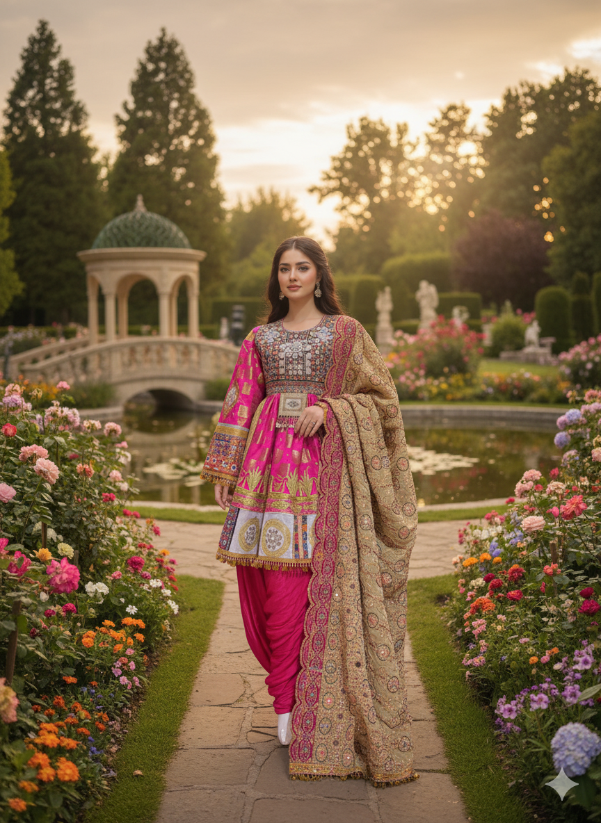 Step into the vibrant world of Afghan artistry with this stunning Pink Afghani Gande, crafted from luxurious Banarasi fabric and paired with a beautiful golden shal. Lovingly handmade by skilled Afghan women in their homes, every stitch tells a story of culture, resilience, and timeless craftsmanship—making this dress more than just attire, it’s a piece of heritage.