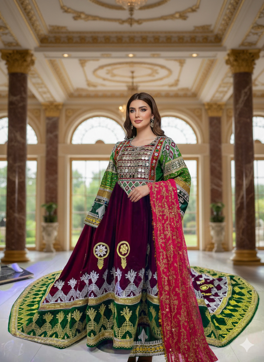 Cultural Embroidery: Showcasing intricate threadwork and mirror embellishments inspired by Bamyan’s heritage, each stitch reflects regional artistry and centuries-old techniques.